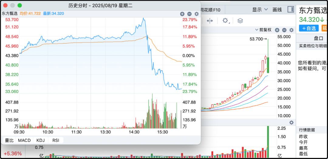 今天资本市场最刺激的一幕出现在港股东方甄选,短短一个小时股价从53.7跌到34.32,回撤幅度达到了惊人的37%。