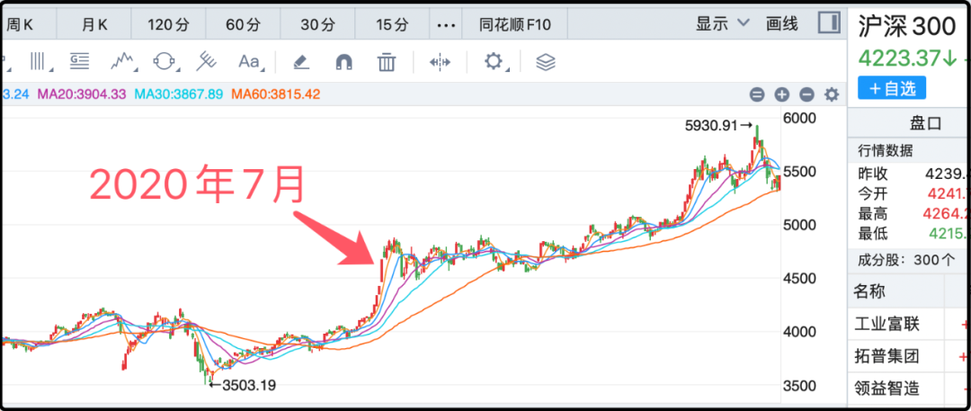 你们看一下这份榜单上的其他日子,排名第1、2、4都是去年9月那波行情,表格里一半的日子是2015年牛市,剩下的都发生在2020年7月初,我可以帮大家回忆一下当时发生了什么,全国正好经历了新冠最紧张的第一轮封控,随着夏天气温升高,大家都以为像2003年非典那样已经战胜疫情,经济活动复苏,货币政策刺激,股市掀起了一波行情。