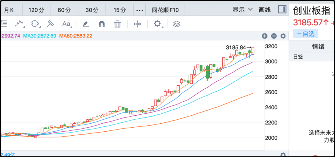 目前大盘的趋势依然稳健,尤其是双创k线,最近3个月都稳稳运行在20日线上方(图中紫线),完全不需要考虑提前下车或者止盈。其实本轮牛市的调整已经非常温和,目前已出的最大回撤只有2015年的1/3程度,如果连这样的车你都坐不住那就很难挣到钱了。