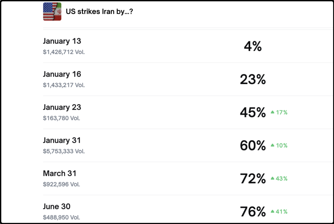 还有网络攻击、心理战以及向中东派遣航母战斗群。目前链上赌场对美军攻击时间的下注,1月23日之前45%,1月31日之前概率60%,3月31日之前72%,均在过去24小时内有大幅增长。