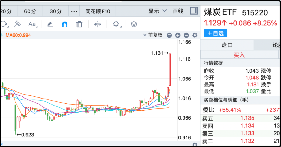 另外今天市场盘中有小作文,传监管部门要对那些超额产能的煤炭予以停产整改,不准再乱挖了,谁不听话就把谁的饭碗砸了。焦煤主力合约过去3个交易日涨20%,焦炭涨13%,煤炭etf(515220)今天爆吹8%巨阳线,成为全市场最靓的仔。