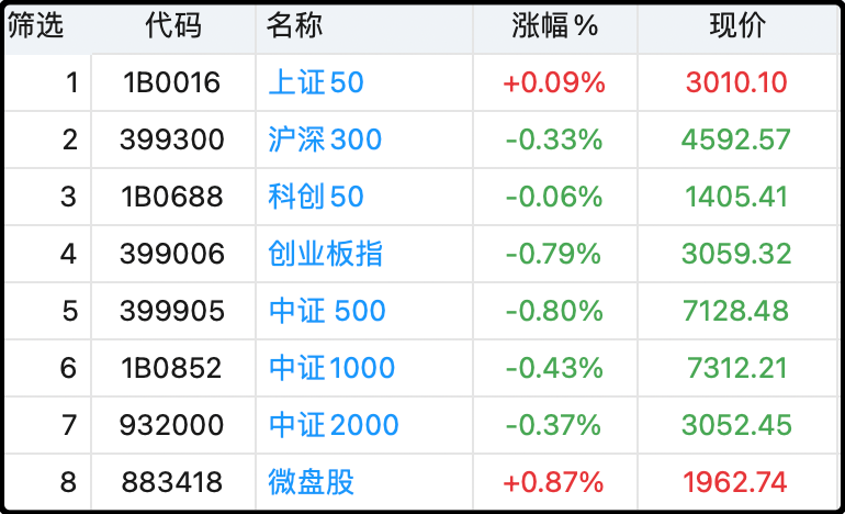 今天a股继续缩量,全天成交1.66万亿,这个量能已经回到了6月底7月初的水平,大量资金偃旗息鼓暂停了交易,市场中位数下跌0.24%,宽基里一头(上证50)一尾(微盘股)是红的,其余都是绿的,腰部的创业板指和中证500跌的尤其多,是因为今天电池和新能源板块表现不佳。