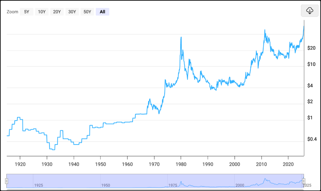 有色板块,尤其是白银概念随着国际银价的突破而大涨。我整理了一下过去100年的白银价格走势,如下图,1915年至2025年。