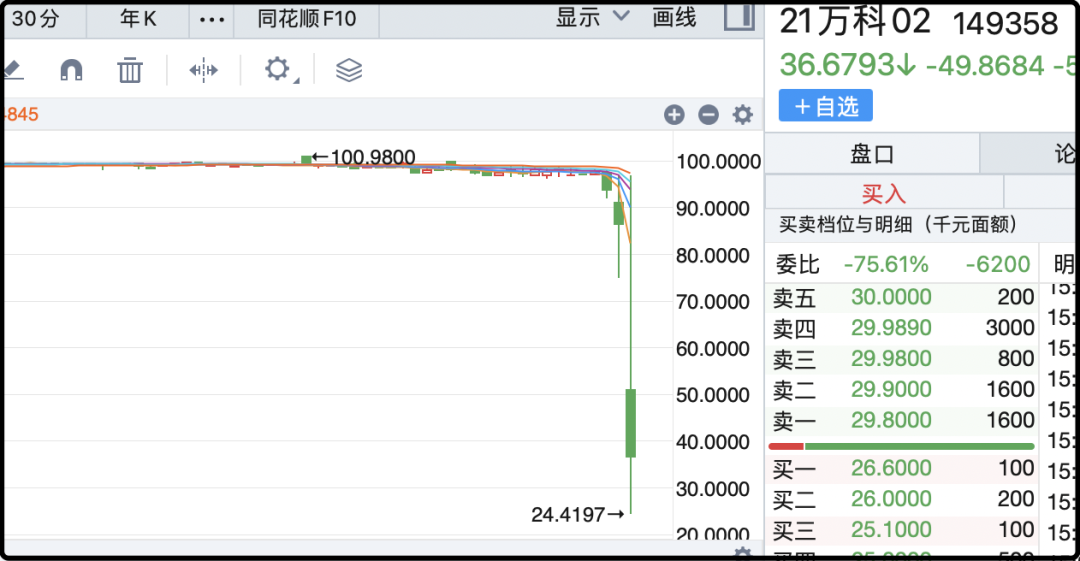 这对债权人来说当然是晴天霹雳,万科债今天暴跌,最惨的21万科02一度跌了70%。这债周一的时候还有98元,2026年1月22日有一个回售选择权,里面的人原本再过2个月就拿回全部本息,但现在一切都变了。