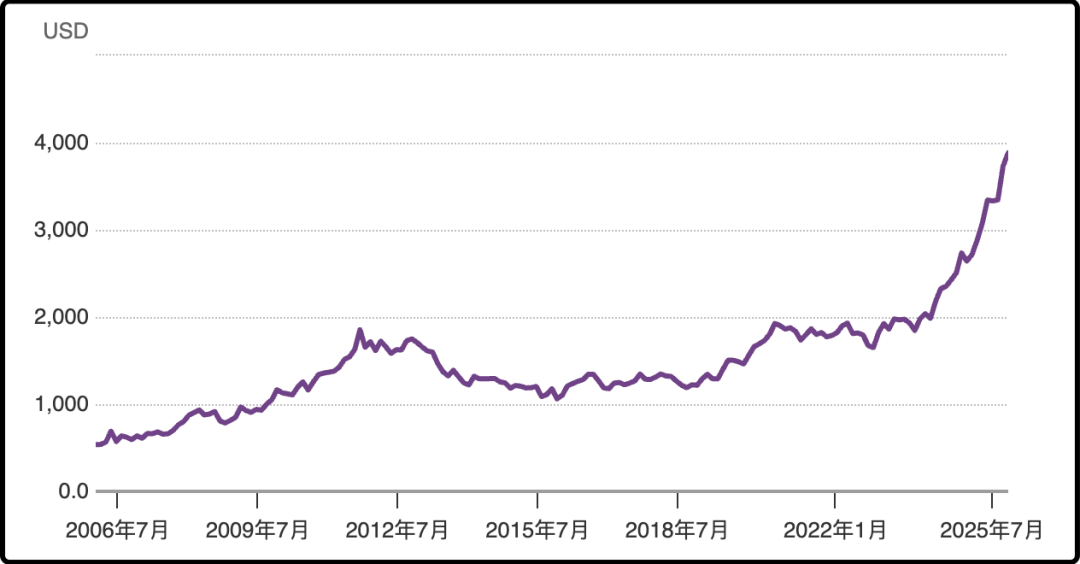 昨晚有个女读者贴了过去10年的金价,我后来仔细看了一下她的数据可能不太对,世界黄金协会的官网有国际金价历史走势,2015年10月大概是1100左右涨到现在的3900。