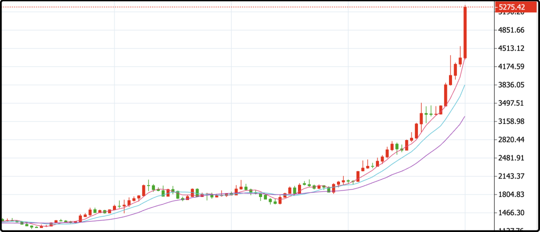 不过市场情绪在最近两个月明显发生了变化,越来越多的投机资金涌入,价格上涨陡然加速,这已经不是正常节奏,更接近于短线冲顶。这一点你们看上面的月k线也能看出来,之前两年单月最大涨幅也就10%左右,一直沿着ma5上行。