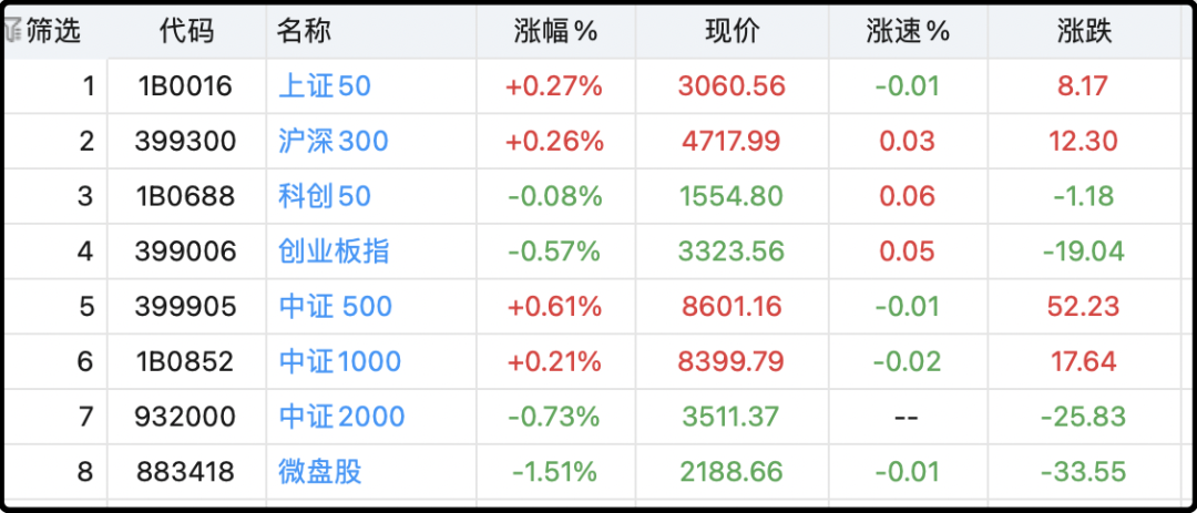 今天a股依然延续了前几天的特点,成交量2.97万亿中规中矩,市场中位数下跌1.05%,8个宽基有涨有跌,让人欣慰的是中证500又一次跑到了头马,我的读者受我影响follow中证500的人特别多,这三个月属实是爽到了![]()