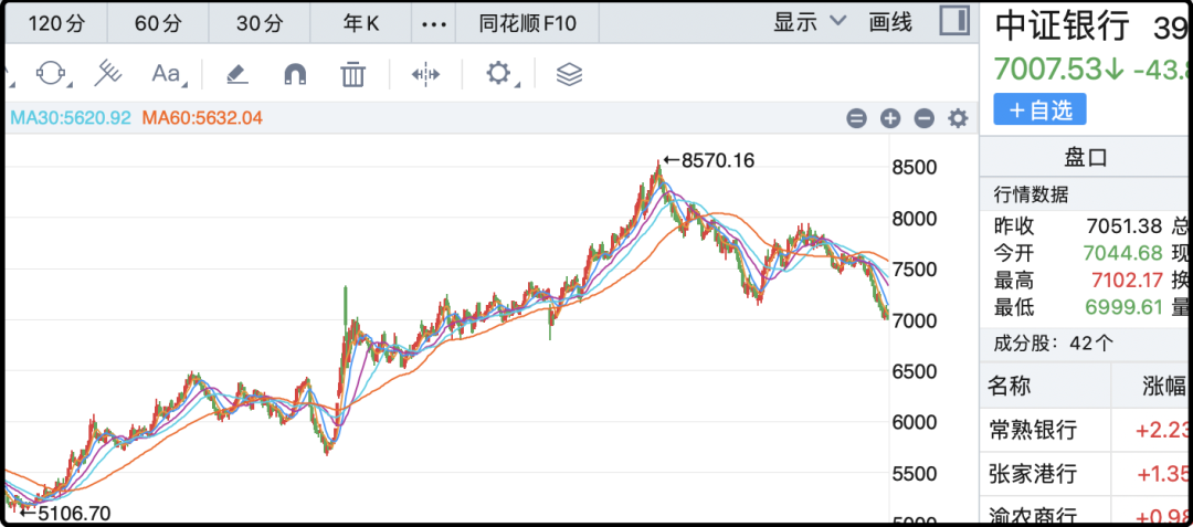 4、这几天银行板块的股民被跌懵了,中证银行指数之前在慢熊市里受益于利率下跌,从从5100涨到8500,不过去年7月a股行情启动后银行板块就见顶了,之后大量抱团资金持续流出,去参与牛市行情,目前已经跌到7000点,最大回撤接近20%。只要a股牛市继续向上,红利板块还有下跌空间,想要趋势扭转除非这轮牛市被终结。