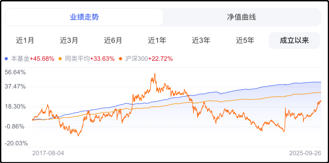 该债基2017年8月成立,图里面上上下下的那条是沪深300,同期表现+22.72%;橙色平缓向上的是债基平均水平,同期表现+33.63%;我买的债基是蓝线,同期表现+45.68%。