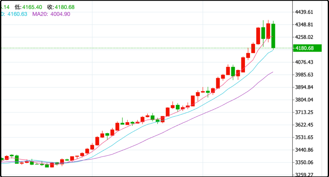 我去,就我写文章这会黄金又跌一波,4180了,我在k线上比划了一下,这波回调可能要踩到4050-4100区间,之前一直后悔没上车的可以看看。