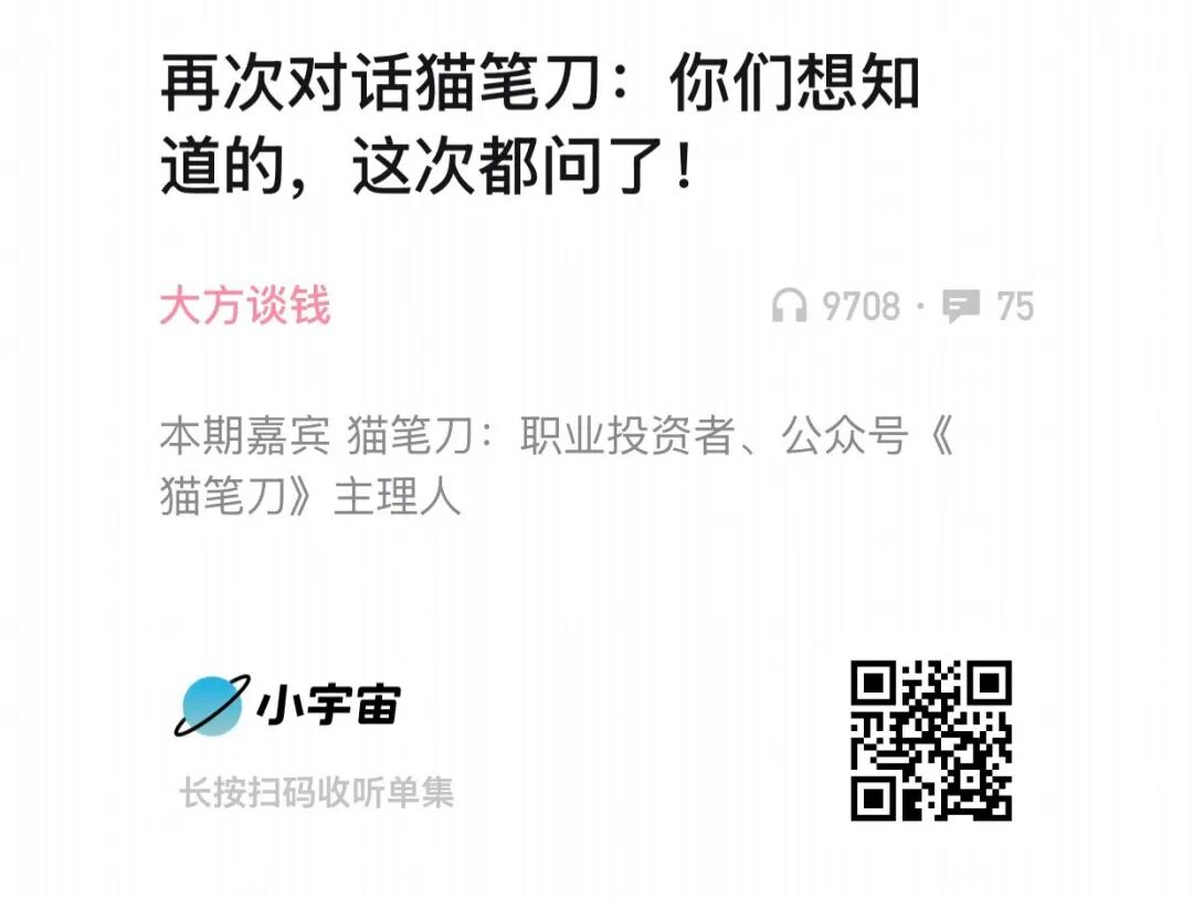 就这些吧,我上周录的播客节目上线了,你们识别下面图里的二维码就能直接在网页上听,但如果想开倍速的话还是得下载小宇宙app。这次节目103分钟,就是收集了上一次你们的留言提问后录的,和房价有关的后期都和谐了,别的还好大部分都能播。