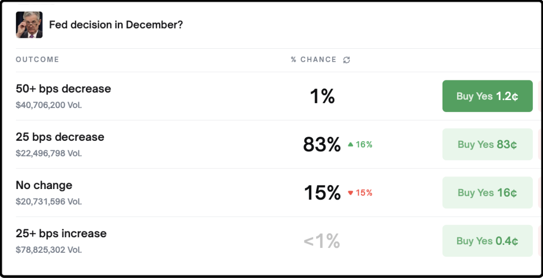 另一个事就是美联储官员昨晚再度释放了12月份降息的信号,机构分析12月降息0.25%的概率从69%上升至82%,链上赌场里对这一事项的下注也涨至83%,目前看12月份虽不是板上钉钉,那也是十拿八稳。受此刺激纳斯达克昨晚大涨2.7%,我早上醒来的时候发现饼圈也普涨4-5%。