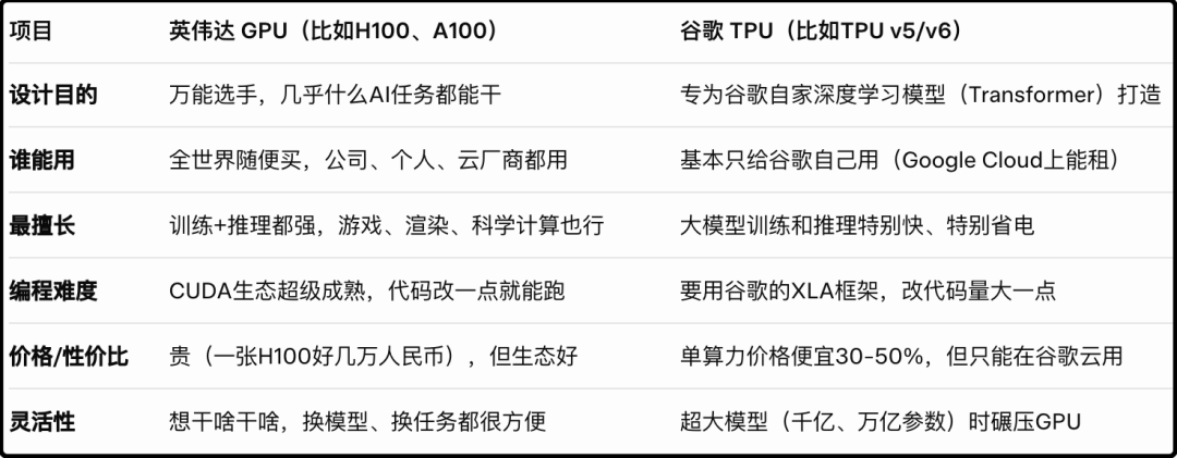 1、这几天市场在下注炒谷歌的TPU,这是谷歌自己研发出来对抗英伟达的GPU的产品,我让GROK给我简要概括两者的区别,如下表格: