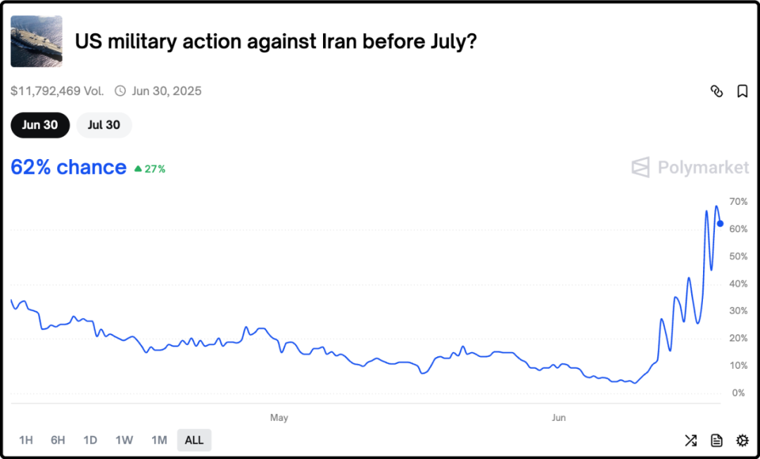 过去24小时的伊以没有太大进展,美国警告伊朗应无条件投降,朗子当然不会听。链上博彩网站里关于美军会不会在6月份攻击伊朗的盘子,概率从前几天的<10%飙升至60%+。