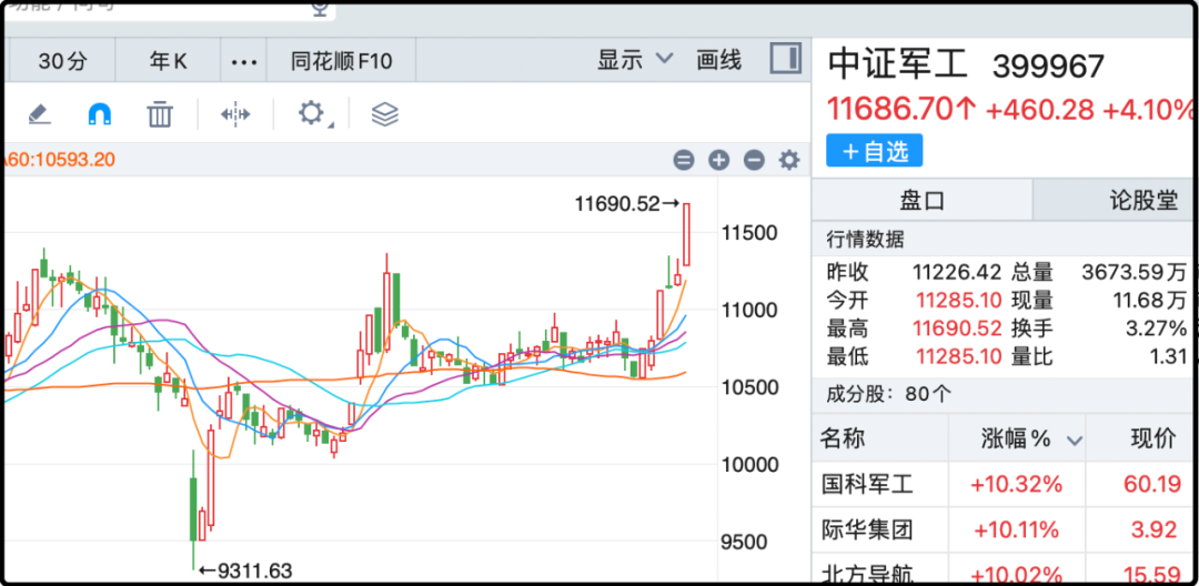 不管怎么说这个消息刺激了军工板块,军工装备+5.4%,军工电子+4.3%,还有就是之前兵装重组概念今天又暴涨8%,整个军工板块的形态十分强劲。作为世界第一制造业大国,中国军工武器的水平很可能整体被低估了,从这个角度看未来出口的潜力还是蛮大的,但是大规模的武器出口很可能会触怒欧美的既得利益链,毕竟他们也有报复的手段。