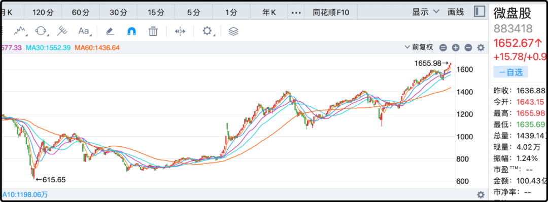 之前有很多读者留言问过,这个微盘股指数是何方神圣,它是万得编制的指数,取样成本是a股市值最小的400家公司,同等权重,每日滚动更新样本股。比如你市值涨了,排名上去了,就剔除出去,换新的小市值股进来。