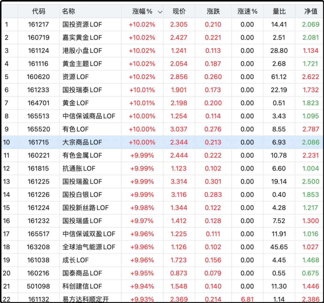今天白银LOF继续涨停,带动市场情绪进一步发酵,涨停潮在lof基金板块蔓延,我看了一下有超过20支lof基金涨幅超过9%。这当然很不正常了,因为这些lof基金都是有明确的底层资产的,你们看我截图的最右边那列,是基金最新净值,这是确定性的,你正常申购和赎回都是按照净值走。
