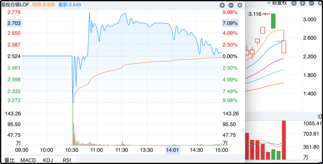 为什么特意要说10点半呢,因为白银lof基金停牌1小时,10点半开始交易。上来短暂的封死跌停,不过只一分钟就被汹涌的买盘给撬开了,价格一瞬间就从-10%拉到了红盘。这个在周末是有预期的,当时经过计算基金的潜在净值离跌停价只有5%左右,在眼下这个市场环境下这个溢率肯定有人投机。