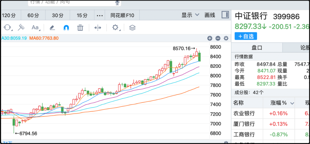 首先说说周五银行板块的大跌,说是大跌其实也就跌了2.36%,只不过大家习惯了银行每天小碎步的持续上涨,突然来这么一下,而且是最近第二次日线中阴回调,又引发了很多人对银行板块前途的争论。