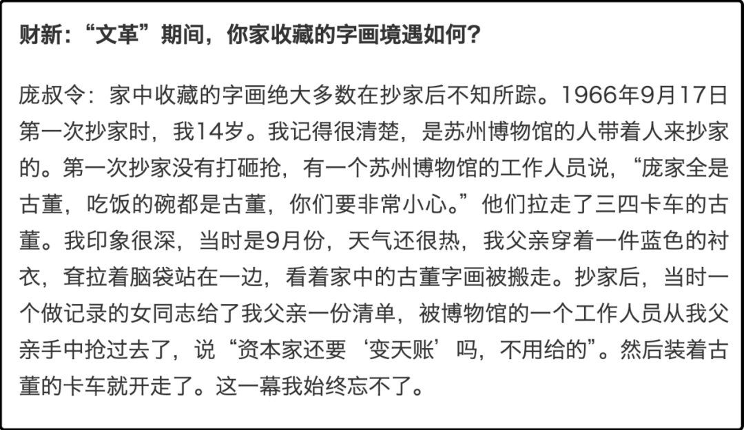 紧接着文革就开始了,庞家被打倒,被抄家,下放农村,全部古董字画都被搬走。“资本家还要‘变天账’吗,不用给的。” 其实从这里回过头看,当初捐出去的也好,借出去的也好,都是明智选择,起码现如今有个体面的说法,如果留在手里也是被“变天账”一锅端的下场。