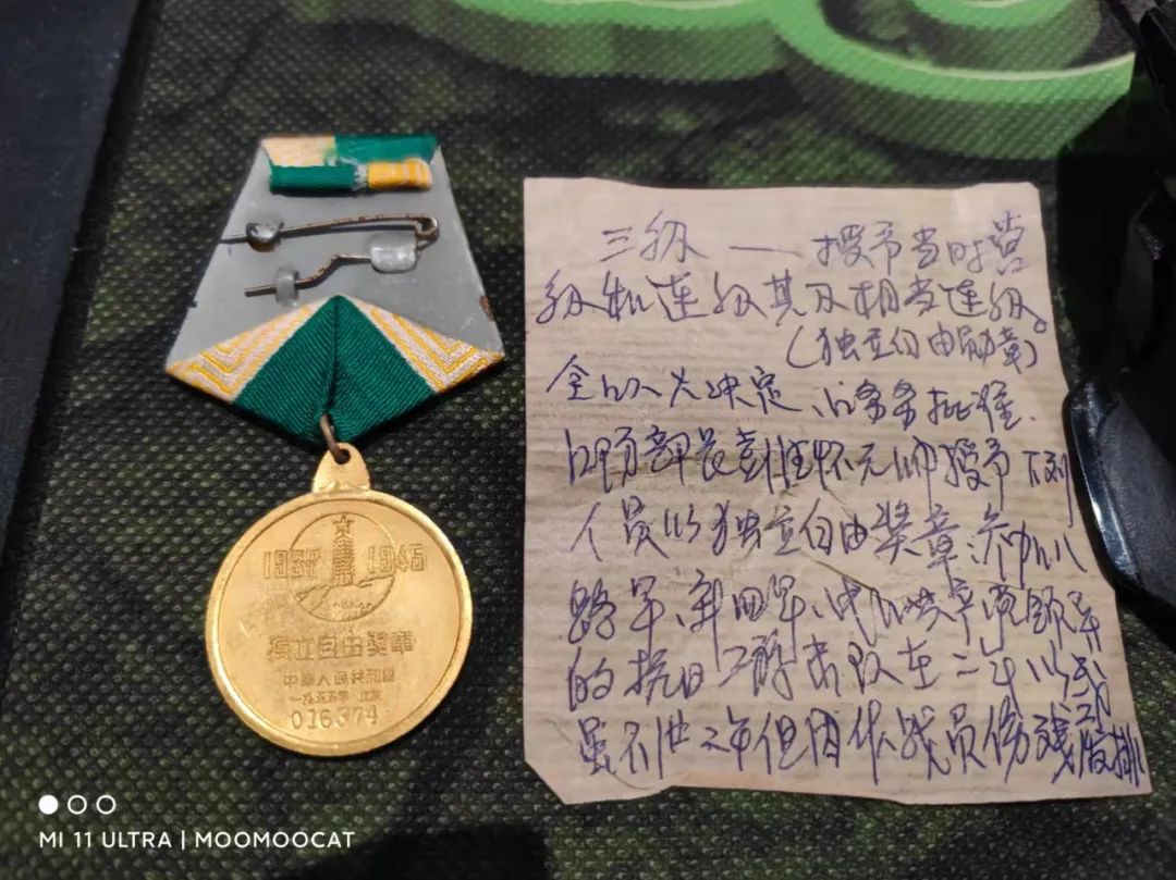 外公读过私塾,会写字,所以用小抄记录了这枚奖章的由来。