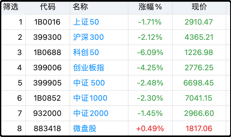 今天大盘继续回调,成交2.55万亿,市场中位数下跌0.41%。个股杀伤幅度不大,甚至在最近几个交易日里算跌幅温和的,但宽指表现惨淡,除了微盘股外跌幅平均在2%以上,最惨的双创分别-6%和-4%。